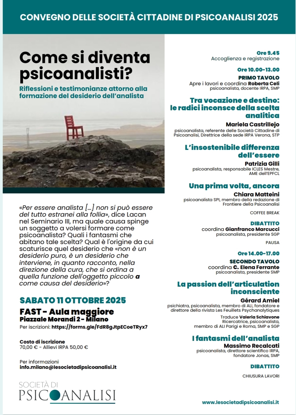 Da queste premesse e spunti si articolerà il Convegno delle Società Cittadine di Psicoanalisi, dedicato al tema della formazione del desiderio dello psicoanalista.