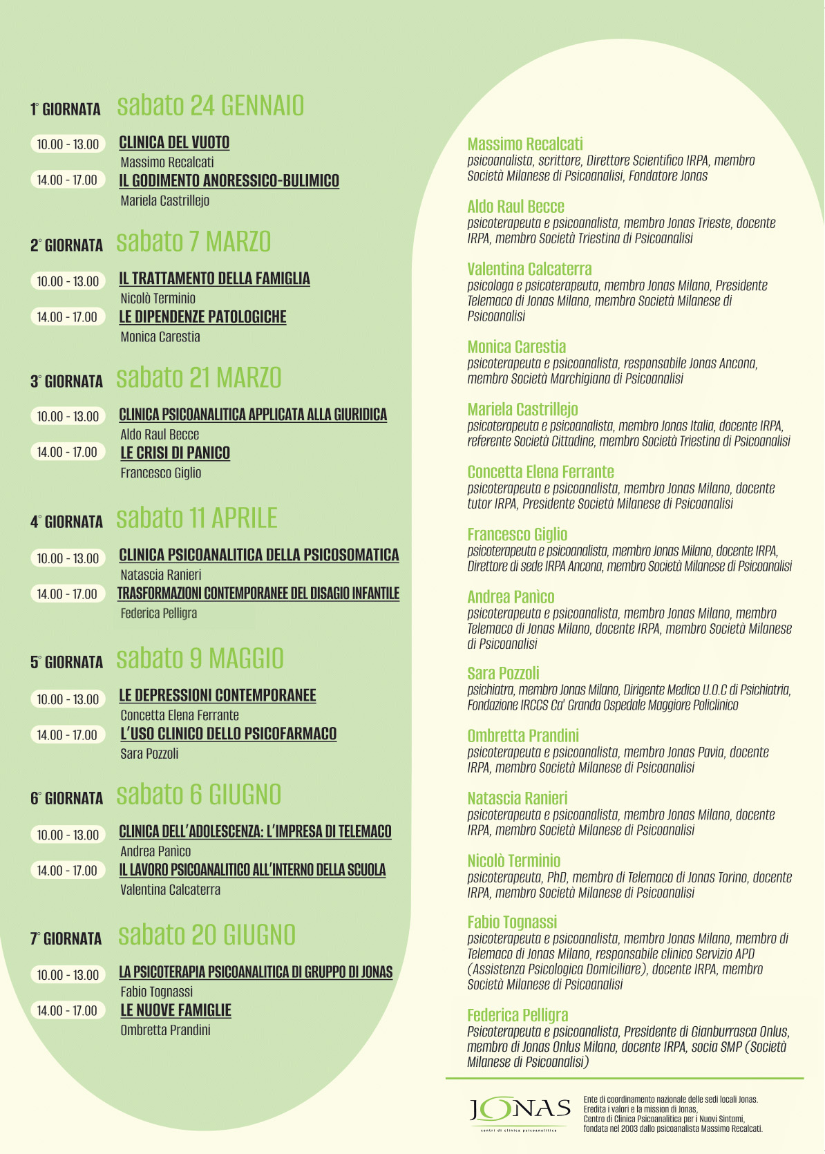 Massimo Recalcati psicoanalista, scrittore, Direttore Scientifico IRPA, Società Milanese di Psicoanalisi, Fondatore Jonas Aldo Raul Becce psicoterapeuta e psicoanalista, membro Jonas Trieste, docente IRPA, membro STP (Società Triestina di Psicoanalisi) Valentina Calcaterra psicologa, psicoterapeuta, Presidente Telemaco di Jonas Milano, membro Jonas Onlus Milano, membro SMP (Società Milanese di Psicoanalisi) Monica Carestia psicoterapeuta e psicoanalista, responsabile Jonas Ancona, membro SMaP (Società Marchigiana di Psicoanalisi) Mariela Castrillejo psicoterapeuta e psicoanalista, membro Jonas Trieste, docente IRPA, referente società cittadine, membro STP (Società Triestina di Psicoanalisi) Concetta Elena Ferrante psicoterapeuta, membro Jonas Onlus Milano, docente tutor IRPA, membro SMP (Società Milanese di Psicoanalisi) Francesco Giglio psicoterapeuta e psicoanalista, membro Jonas Onlus Milano, docente IRPA, direttore sede IRPA Ancona, membro SMP (Società Milanese di Psicoanalisi) Andrea Panìco psicoterapeuta e psicoanalista, membro Jonas Onlus Milano, membro Telemaco di Jonas Milano, docente IRPA, membro SMP (Società Milanese di Psicoanalisi) Sara Pozzoli psichiatra, membro Jonas Onlus Milano, Dirigente Medico U.O.C. di Psichiatria, Fondazione IRCCS Ca’ Granda Ospedale Maggiore Policlinico Milano Ombretta Prandini psicoterapeuta e psicoanalista, membro Jonas Onlus Pavia, docente IRPA, Presidente SMP (Società Milanese di Psicoanalisi) Natascia Ranieri psicoterapeuta e psicoanalista, membro Jonas Onlus Milano, docente IRPA, membro SMP (Società Milanese di Psicoanalisi) Nicolò Terminio psicoterapeuta e psicoanalista, membro Jonas Onlus Milano, responsabile clinico Servizio APD (Assistenza Psicologica Domiciliare), docente IRPA, membro SMP (Società Milanese di Psicoanalisi) Fabio Tognassi psicoterapeuta e psicoanalista, membro Jonas Onlus Milano, membro Telemaco di Jonas Milano, responsabile clinico Servizio APD (Assistenza Psicologica Domiciliare), docente IRPA, membro SMP (Società Milanese di Psicoanalisi) Federica Pelligra Psicoterapeuta e psicoanalista, Presidente di Gianburrasca Onlus, membro di Jonas Onlus Milano, docente IRPA, socia SMP (Società Milanese di Psicoanalisi)