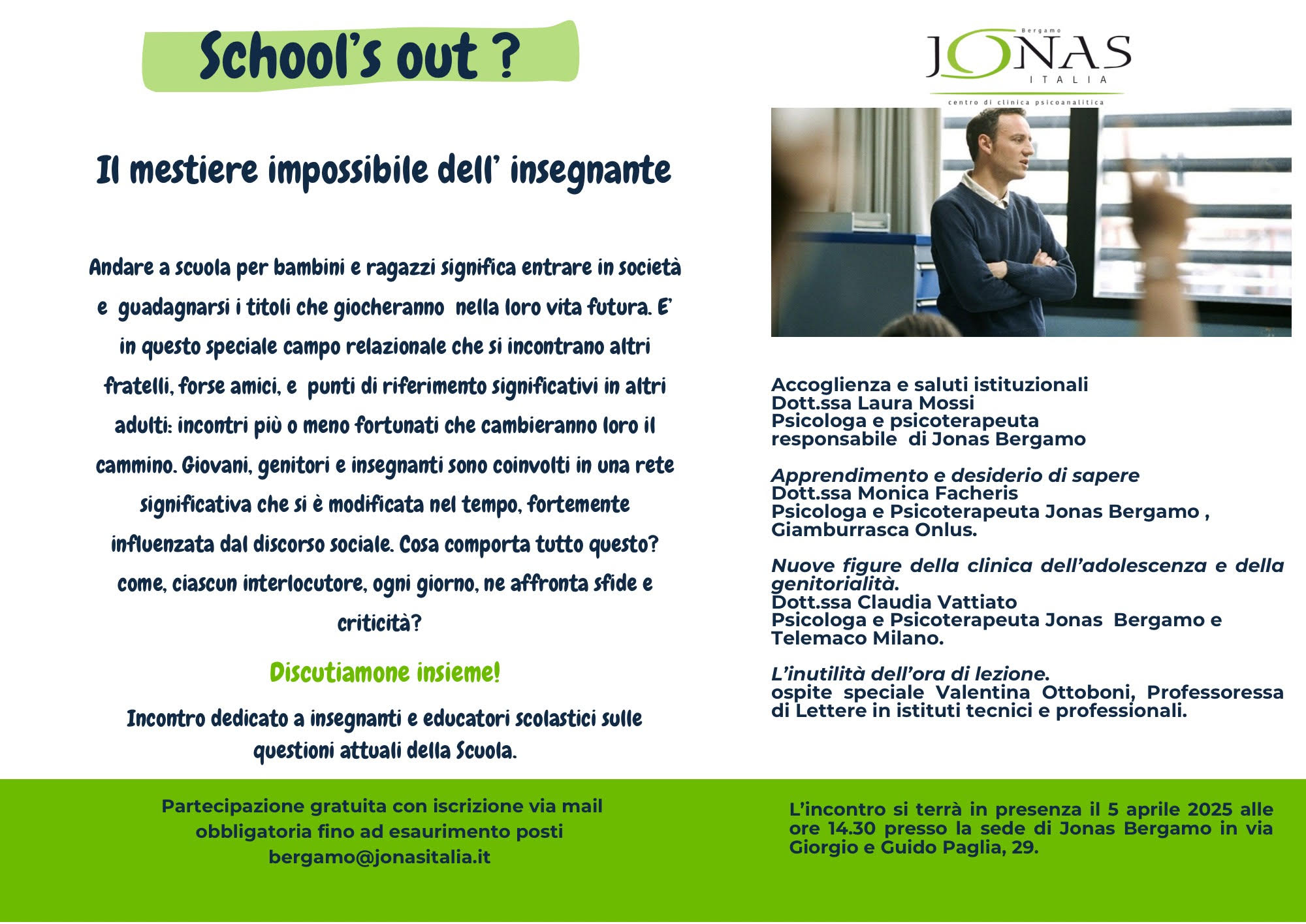 Partecipazione gratuita con iscrizione via mail obbligatoria fino ad esaurimento posti bergamo@jonasitalia.it.